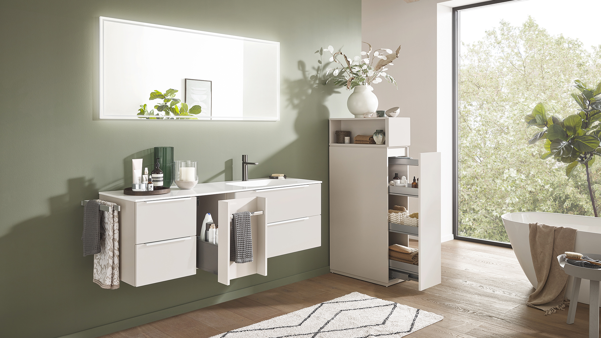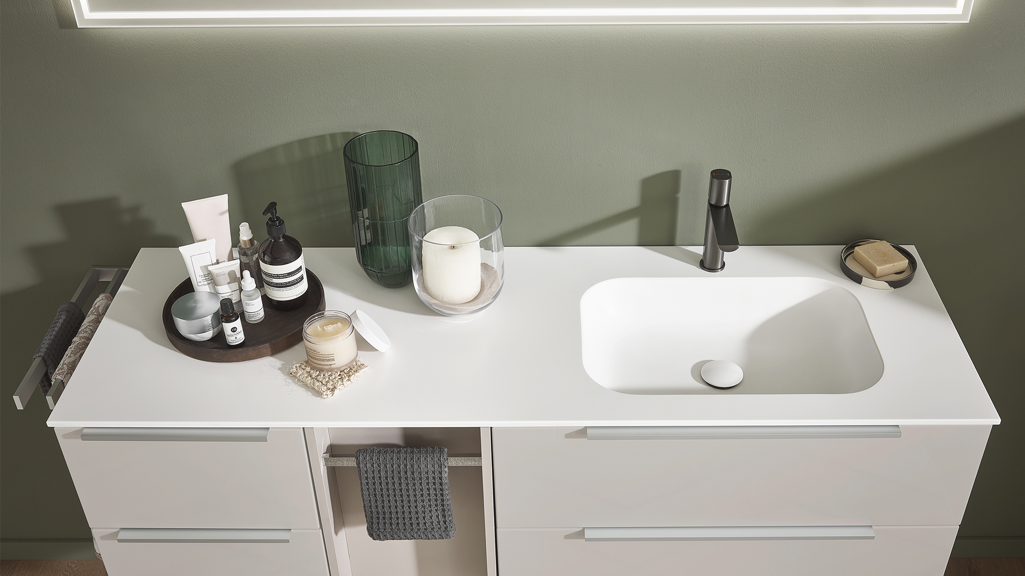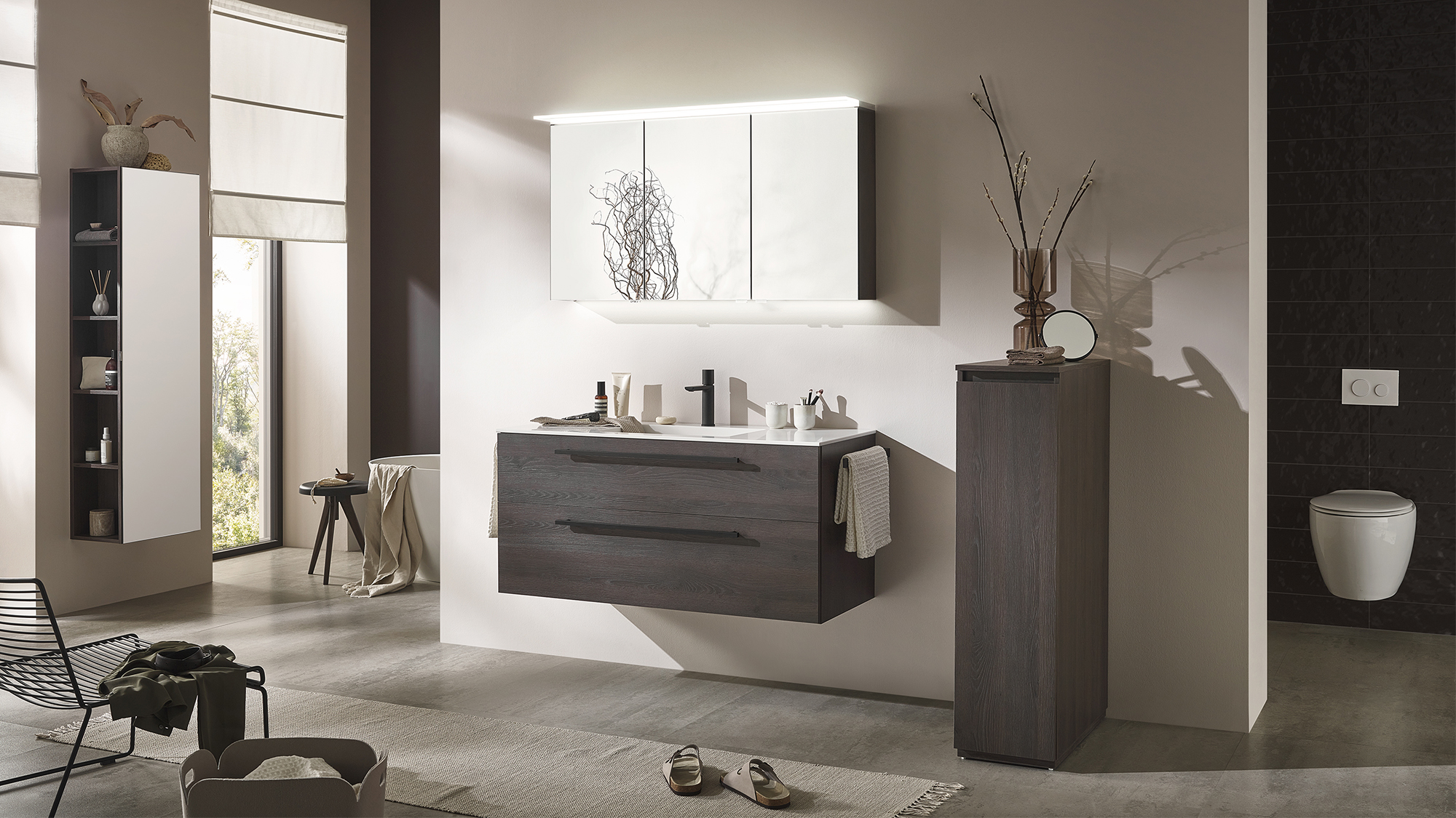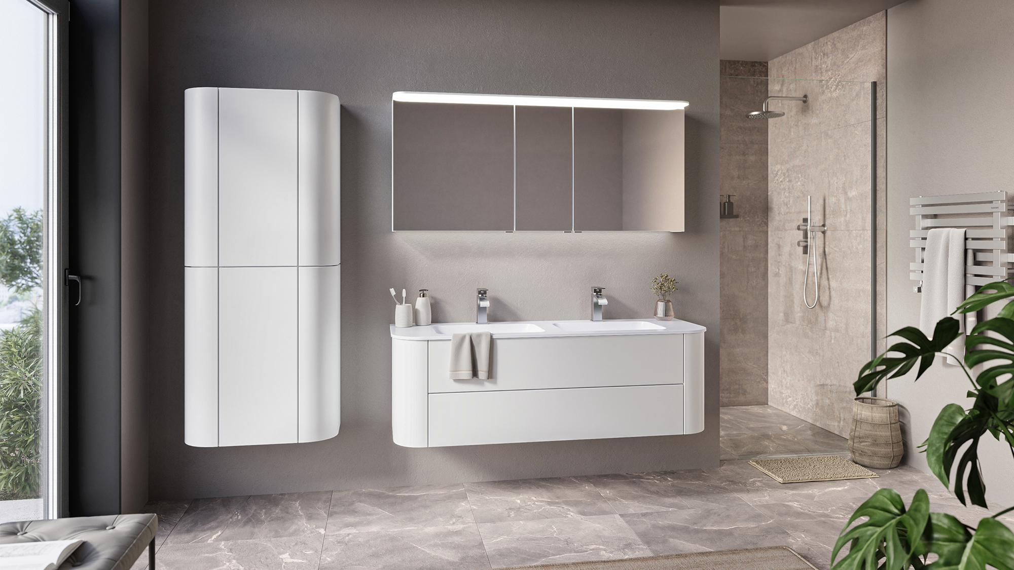 Mit Veluna zieht ein neues Badmöbelprogramm ein, das modernes Design mit cleverer Funktionalität verbindet. Charakteristisch sind die sanft gerundeten Seitenwangen, die in verschiedenen Akzentfarben erhältlich sind und dem Bad eine individuelle Note verleihen.