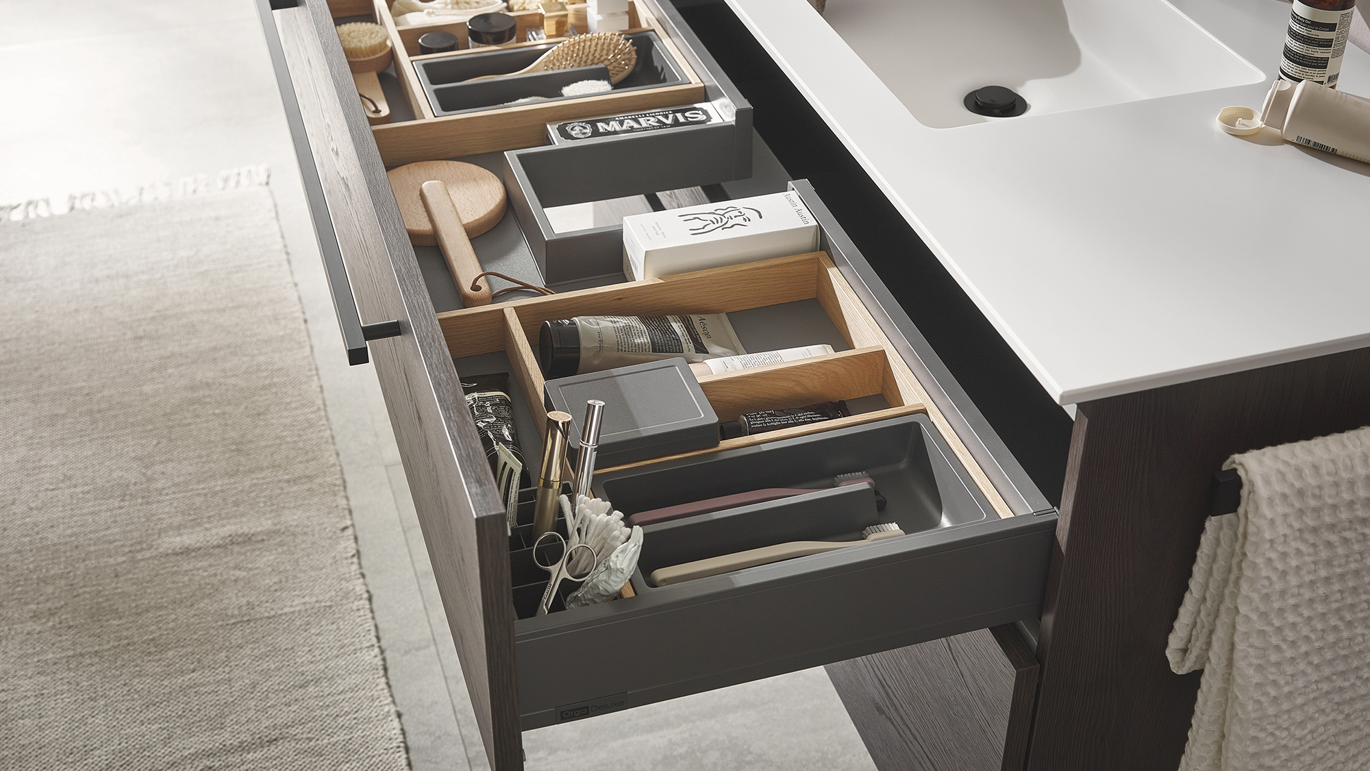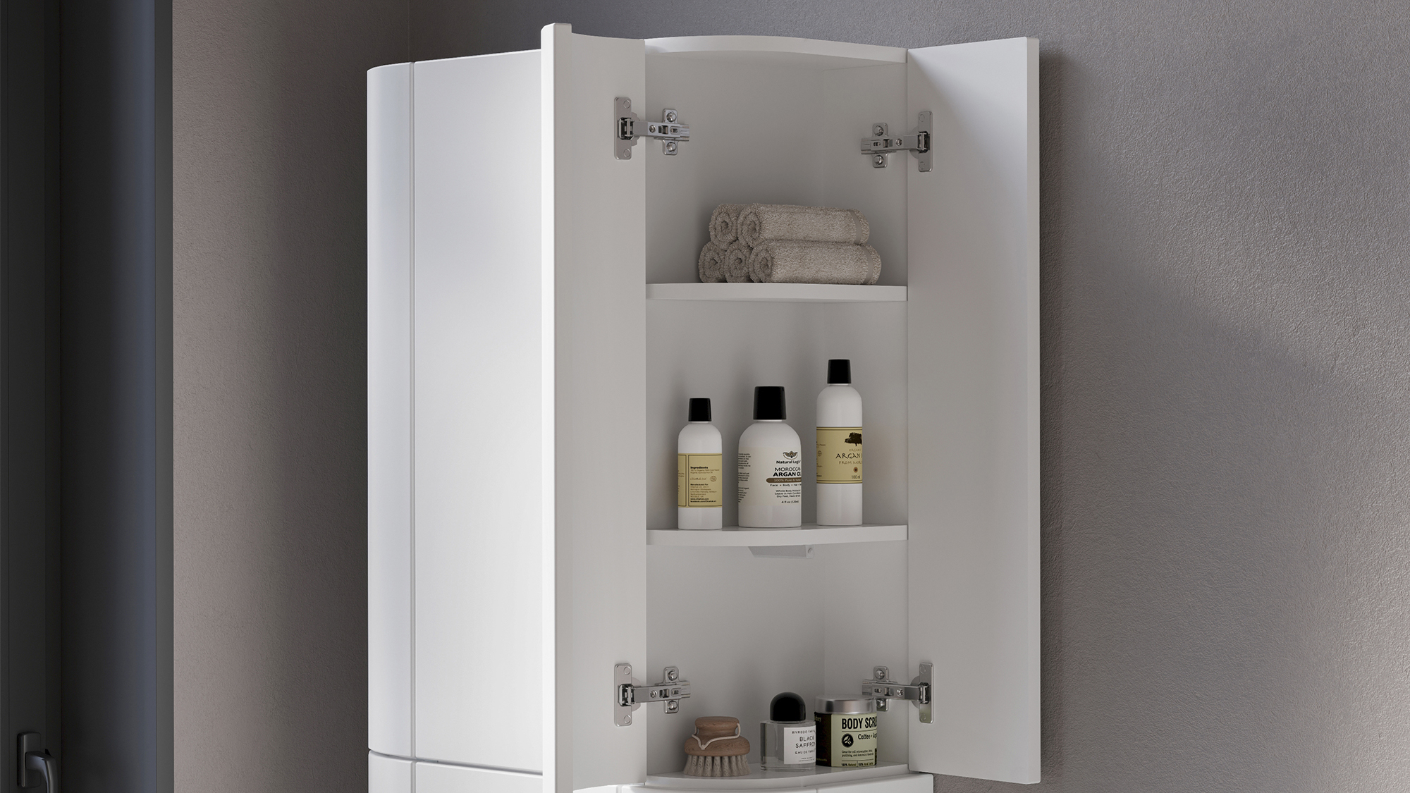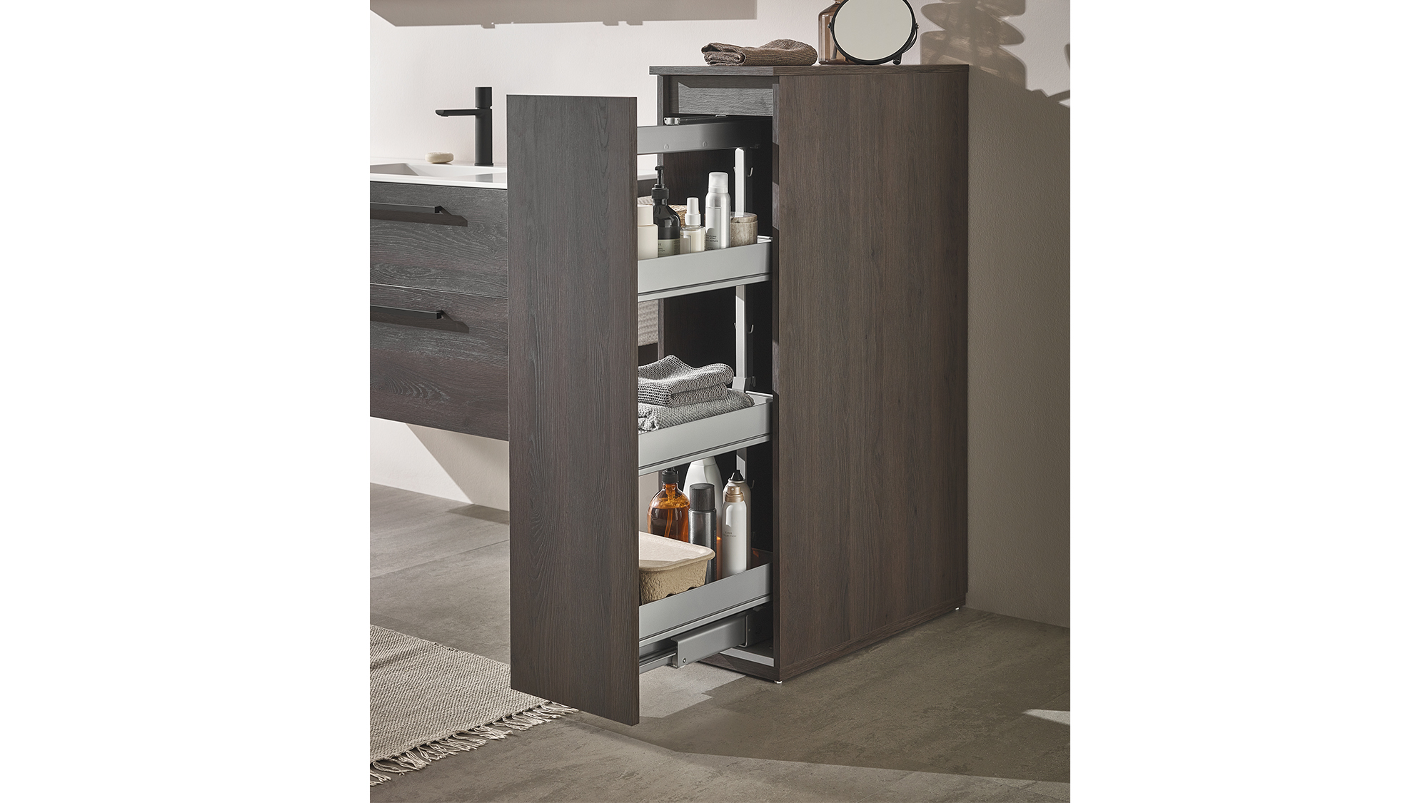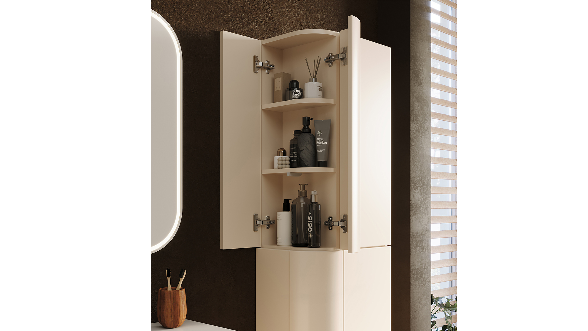 Mit Veluna zieht ein neues Badmöbelprogramm ein, das modernes Design mit cleverer Funktionalität verbindet. Charakteristisch sind die sanft gerundeten Seitenwangen, die in verschiedenen Akzentfarben erhältlich sind und dem Bad eine individuelle Note verleihen.